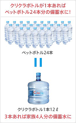 東日本大震災、九州大地震…30年以内に90%以上の確率で起こると言われている南海トラフ大地震。南海トラフ大地震が起こると、大阪府の94%が断水すると報道されています。さらに、福井原発事故が誘発されると琵琶湖放射能汚染により、近畿圏の水道水は壊滅状態に陥るとの推察もあります。また、昨今の雨の降りかたは異常で、街を破壊し、家屋や車を軽々と流し去ってしまいます。もはや停電や断水は日常茶飯事と言っても過言ではありません。そんなとき、一番大切なものは何でしょう?そう、飲料水です。クリクラのウォーターサーバーは、ボトル上差し&手動コックなので停電しても断水しても大丈夫!いつでも安心安全なお水を確保できます。タッチパネルやボタン式のサーバーは、停電時作動しません。また、ボトル足元収納式のサーバーも同様、ポンプ不作動により出水することができません。クリクラのボトルは1本12ℓ。常時ボトル3本(36ℓ)を備蓄するのが理想的です。新しいボトルが届くたび先のボトルから使用しながら、常に新鮮なお水をストックする、ローリングストックです。